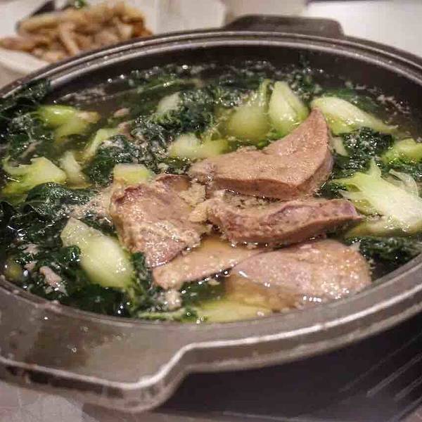 猪润水浸斗白菜。猪肝和小白菜同煮的,随便吃吃。
