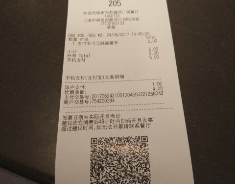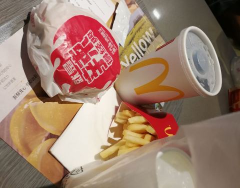 地方很好找。地铁口。买完上地铁。久光附近的芮欧百货下二层。完全不会迷路。支付宝口碑日活动。五元优惠到一元。点单爽快,也不会问你还要别的吗。记得要十点半后去才有薯条。吃出了芝士汉堡味道。上面芝士很多。下面就是没有k酱。服务不错。叉子没给,还叫住我。要不我得手抓了。