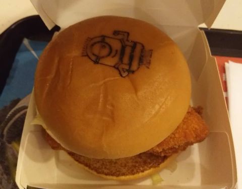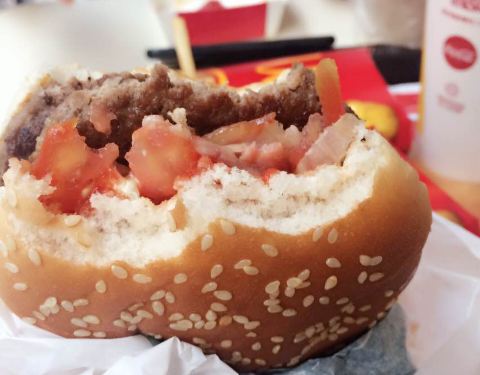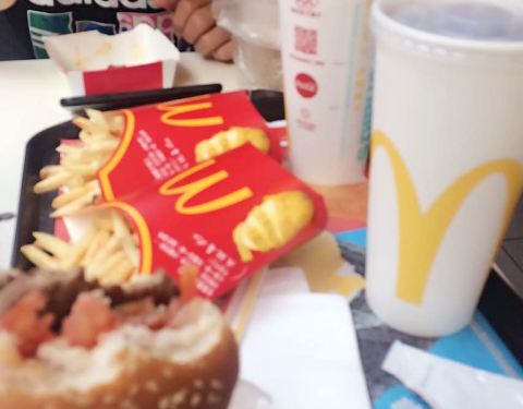 我们两个人点了两个套餐,一个巨无霸汉堡和培根蔬萃,我吃的是培根的吃起来很好吃,培根和肉嫩嫩的,中间放了西红柿有点酸,不过可以解肉的腻味,不错,薯条好吃