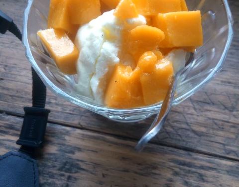 建在河边上的甜品店,装修得像一个临河的长廊,芒果是主打,芒果西米露、芒果芋圆捞、芒果黑糯米、芒果奶昔…