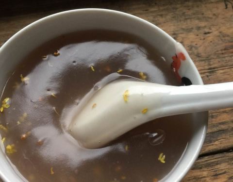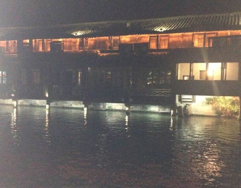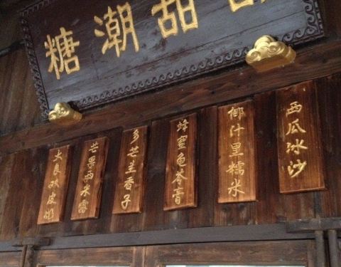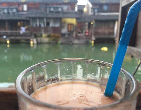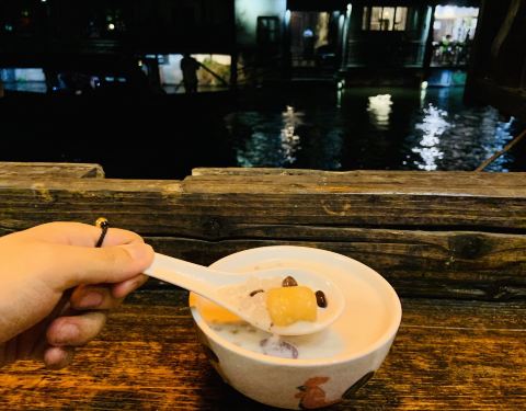 这几天乌镇的天气还是有些闷热,晚上夜游西栅虽然有些许凉风,不过还是有些出汗的。在西栅女红街附近有一家乌镇的老甜品店糖潮甜品,这家店的位置特别好,就在小河边上,坐着吃甜品还能看到小河上的摇橹船和对岸的烟火。
