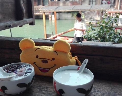 这家好像是连锁品牌,在乌镇西栅最中心的位置女红街开有分店。二三十元左右的甜品,价钱还算是能接受的范围,出品也不错。关键是窗边设立一排面向西市河的桌子,可以歇脚、观景、饮食三不误。