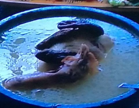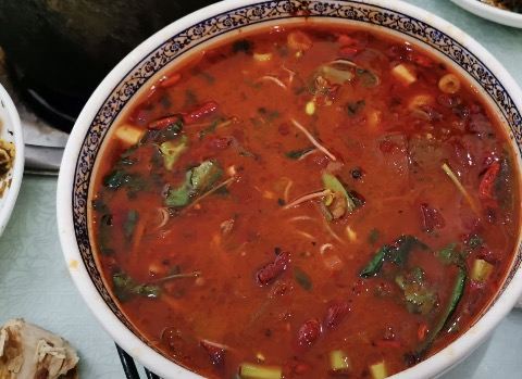 这鸡是 林芝 地区的土鸡,也叫“藏鸡”。打捞了一下,汤里还有何首乌、当归、天麻、百合等,其中还有一种手掌形状的东西——“手掌参”。店家还配了蔬菜、豆腐、香菇等,让我们涮着吃,跟平常吃火锅差不多。