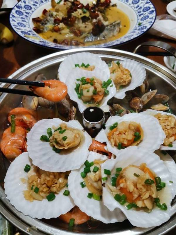 蒸汽海鲜锅很大一份,扇贝是按人数来算,一人一份,下面还有花蛤大虾,新鲜好吃。