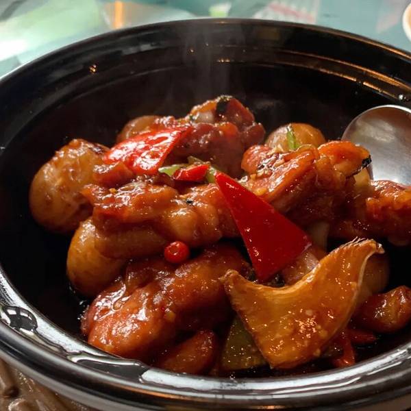 很隐秘的院落,环境很典雅、大方,就餐的氛围非常不错,古风古韵。杨枝甘露,让人满意的一道甜品,解腻又好喝,点赞点赞。芥末鸭掌,已经去骨了,吃着方便,芥末的味道很刺激噢。