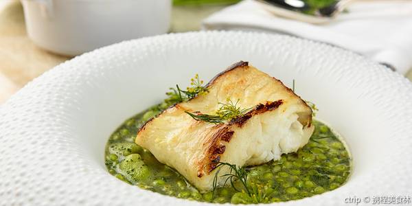 味增酱烤鳕鱼搭配蚕豆,青豆及黑蒜墨鱼汁马铃薯泥