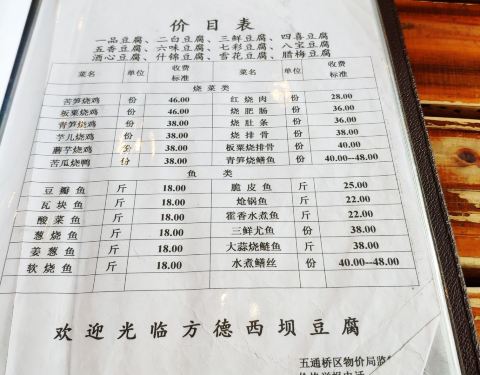 其实西坝也不是哪里都有西坝豆腐,镇上也只有几家。我们在路边问一个当地人哪家西坝豆腐好吃,当地人给我们推荐的方德西坝豆腐。服务员强烈推荐的蟹黄豆腐,虽然很多地方都能吃到蟹黄豆腐,不过他们家的还真好吃,非常鲜嫩。水煮豆腐,和水煮鱼的味道一样,里面有鱼和豆腐。灯笼豆腐,炸过的豆腐里加入肉末,裹上外面的糖醋酱,外酥里嫩,酸酸甜甜,如糖醋鱼一般。
