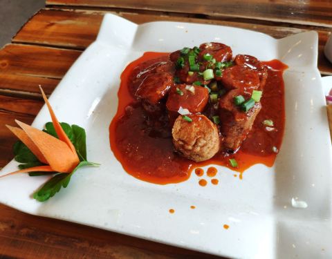 到乐山来办完事,搜到附近这家评价还不错就打算过来尝尝。结果过来的路有点窄,一路上大车很多灰尘太大。这边应该是一个小镇,这家在路口上很显眼,看门面也装修得很好。 [环境]内环境还将就,在小镇上应该算好的,以我眼光看一般。 [服务]点菜上菜都很快,态度不错。 灯笼豆腐里面夹的韭菜肉馅,带点点辣味。 回锅肉火候还差点,不及格。 炒凤尾比较清淡,合我口味。 路过可以去尝尝,不必要特别去一趟。