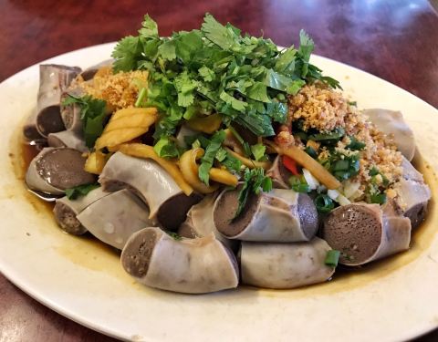 米马河是老南宁都知道的家常菜馆,最出名的是木桶猪脚,猪脚腌制入味,先卤后炸,再装入木桶上桌,咬一大口只感觉到外脆里嫩,没有丝毫油腻的感觉。老友炒牛杂和酸笋炒青菜颇具广西风味,粉角可以说是出了南宁就吃不到了,炒熟的馅料用晶莹剔透的米皮包成三角形,好吃又饱肚。