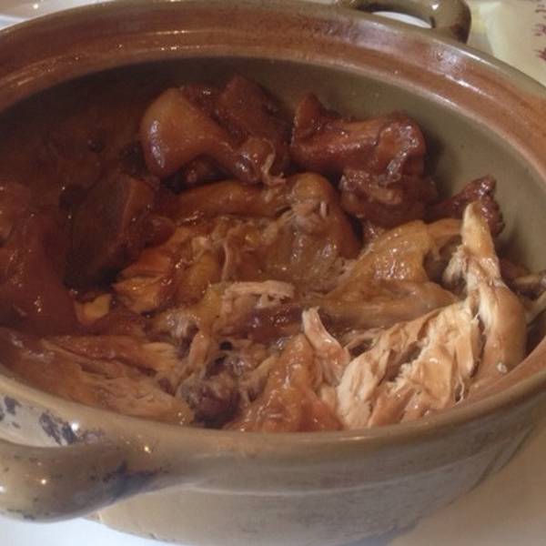 【猪手炖土鸡】58元。炖得烂烂的,酱是甜&咸的。刚吃还好,但是两个人吃到一半就开始腻了。