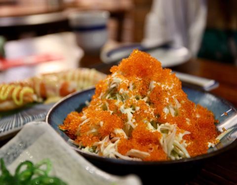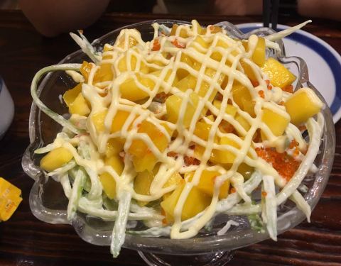 排队等了半个多小时 等候时间有金鱼观赏 还是接吻鱼哈哈哈 三文鱼超好吃 男朋友还想点多一份 被我阻止了 芒果沙拉 拉面都超好吃