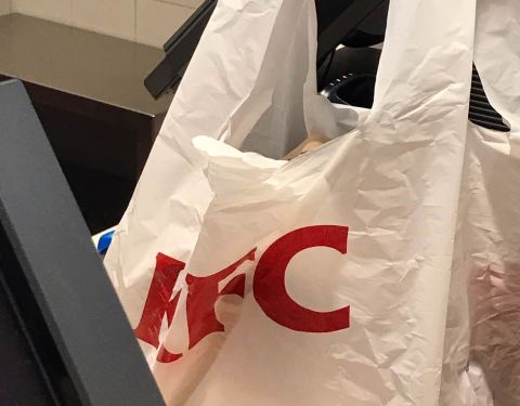 一个人点了双人餐,店员很贴心的送上了打包袋,还是推荐全家桶,一个人一桶岂不是美哉