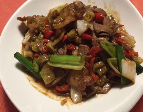 ...,酸萝卜炒牛肚丝下饭,黑椒排骨以前吃过,味道不错,牛肉夹膜第一次吃,猪脚好辣,空心菜倒是比较嫩