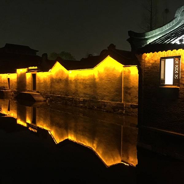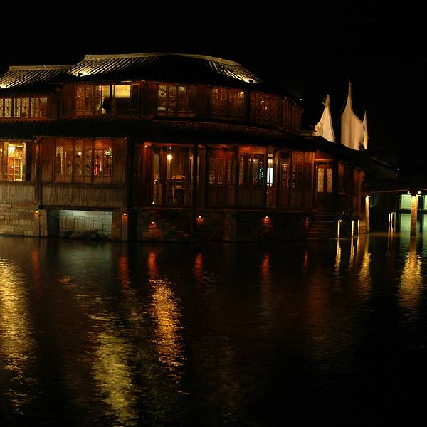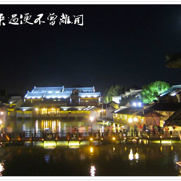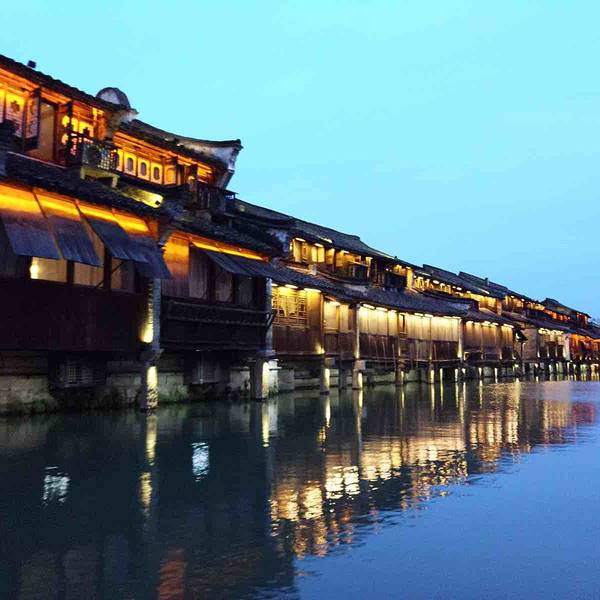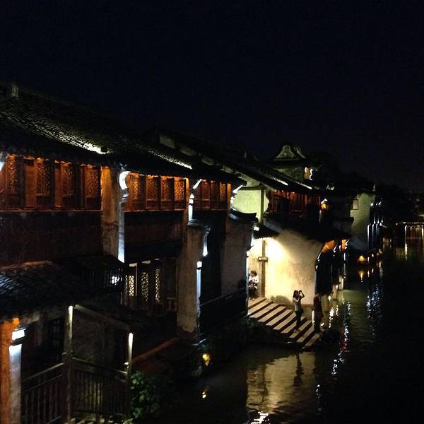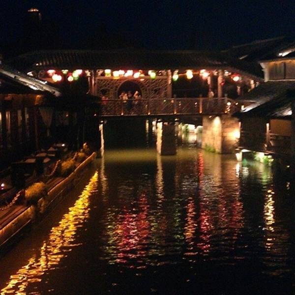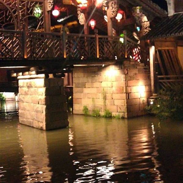 西栅不比东栅。东栅的过度商业开发让人感觉就像贩卖商铺一条街的感觉。西栅则相比宁静许多。首先西栅必须乘船进去。其次西栅沿河基本为民宿。如果你住在西栅内,那么可以像我一样,8点后出来溜达。人少了。安静了。亮灯的建筑,印着河面交相呼应显得非常灵动。