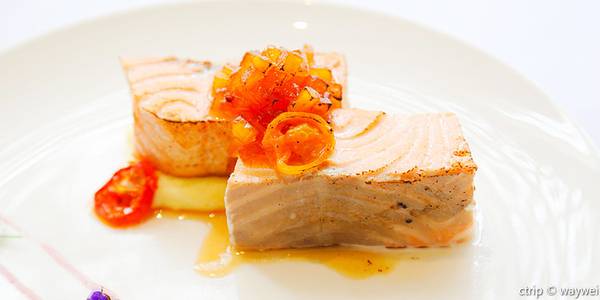 中午12点多去的,只有几桌客人,餐厅挺幽静,大面积的玻璃窗让餐厅显得很敞亮,很舒适,上档次。我和朋友两个人点了一个388的套餐,服务员告知如果提前一天订购套餐的话是免收百分之十服务费的。甜品不错,黑松露...中午12点多去的,只有几桌客人,餐厅挺幽静,大面积的玻璃窗让餐厅显得很敞亮,很舒适,上档次。我和朋友两个人点了一个388的套餐,服务员告知如果提前一天订购套餐的话是免收百分之十服务费的。甜品不错,黑松露蘑菇汤很香浓,蘑菇味很鲜。套餐里的牛排一般吧,没啥可圈可点的地方。三文鱼排还可以,三成熟的,外面刚刚熟,里面嫩,滑。