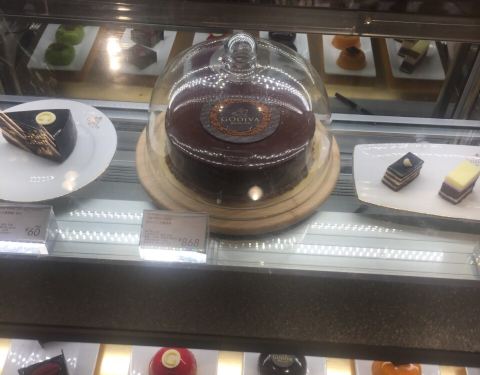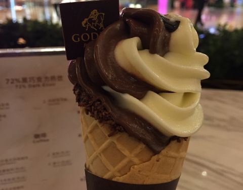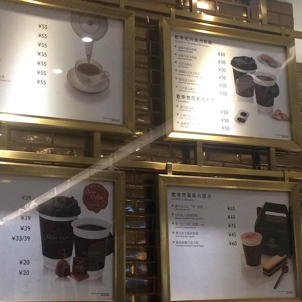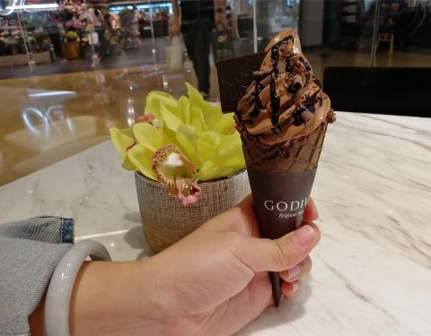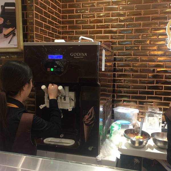 太古汇店位于广州天河区太古汇商场负一层。店铺挺大的,都是巧克力柜台和货架。售卖包装和散装的巧克力,还有现场先做的冰淇淋。因为店铺内还提供一些现场制作的食物,所以店铺内外都提供有座位。铺内座位环境好,灯光明亮,座位舒服,都有沙发椅,但是不多,只有几个桌子。铺外也有桌子,比铺内多,但是很简易,是敞开式在商场中庭放了一堆桌椅,高消费座位差,让人有点不爽。godiva主要做巧克力,巧克力豆不是现场做的,都是预先做好,然后一盒盒卖,或者散装按重量称。