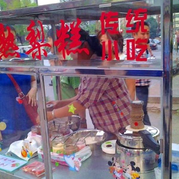 熟梨糕,对于天津的孩子们来说,这可能是他们儿时记忆中最喜欢的美食之一,绝对要比津门三绝要好吃得多。小时候几乎在每条大街上都能看到卖熟梨糕大爷、大妈的身影,现在想要吃上一次却要碰运气。卖熟梨糕的大爷、大妈一般会拉一个小推车出来,上面放着一个高压锅似的蒸锅,旁边放着糯米面以及各种蘸料,把糯米面放在熟梨糕的模子上,再把模子放在高压锅的顶部,发出“呜呜哇哇”的声音,不一会儿就熟了,之后再往上面抹上馅料,一个标准的熟梨糕就做好了。【美食位置】:一般不固定,总是像打游击一样到处逛,有夜市的地方一般就会有卖的。【价格】:小的时候一块钱一大盘子,盘子是用江米做的,可以吃的,一盘大概有六个,现在要五块一盘,有个甚至一块一个。 【营业时间】:早上几乎看不到,一般晚上才会出摊儿。