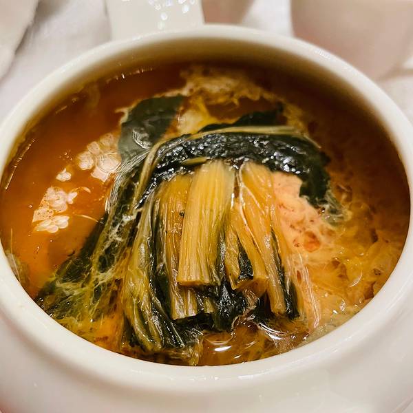 不知道是因为预感到飞机要延误的心情不佳,还是菜品真的太普通,我没有办法给这家店我的bottom up分。(给4-0.1分好了) 但是有一点是肯定的,这家店的菜没有办法改变我烦躁的心情。 上冰水,谢谢,我给满分,然后就开始减分了。 羊肚菌鲍鱼炖花胶,不扣分,大概是我喝不惯,然而蛋白质的酸味确实太明显了。 乳鸽,标准好吃,不过蘸料的搭配带出了很多细心,这个是好评的。 炒饭的功力很到位,米粒都散发着香味,豆豉鲮鱼炒生菜的火候和调味都让我满意。 这么看来,是我心情太差了。。。。(并没有减分呀)大概是午饭没有喝酒吧。 就这么决定了,过段时间再来一次,重新点评吧。