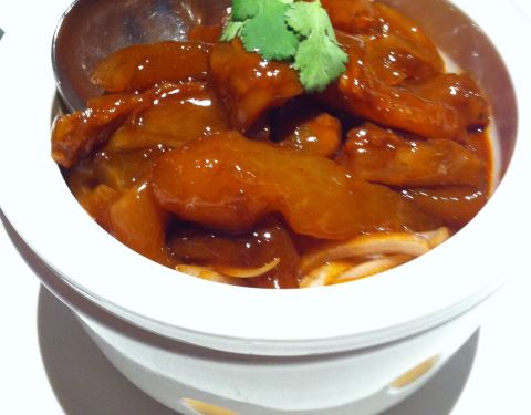 老汤红炖牛筋 做法与红烧相相类似,牛筋用高汤、酱油等酱料炖过,又软又香又入味。 出品主打江浙菜