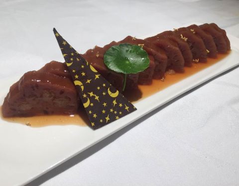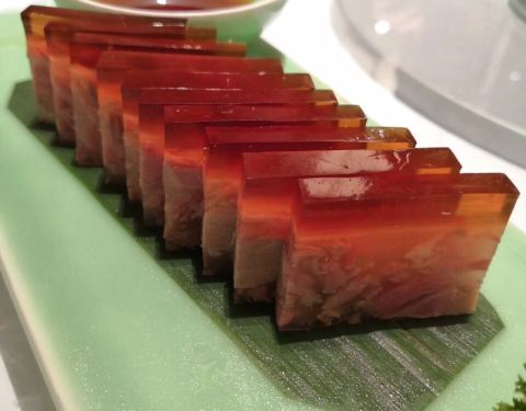 这家江南厨子位于天河路太古汇负一层,与地铁三号线岗顶站和公交车BRT岗顶站无缝连接,交通便利。 这家店的店面不很大,装修的古色古香,气质高雅,处处显示出江南水乡的风情。 出品主打江浙菜。 香椿酱拌豆皮 分量不大,制作精致,一小碟豆皮充满了香椿特有的香味。 老汤红炖牛筋 做法与红烧相相类似,牛筋用高汤、酱油等酱料炖过,又软又香又入味。