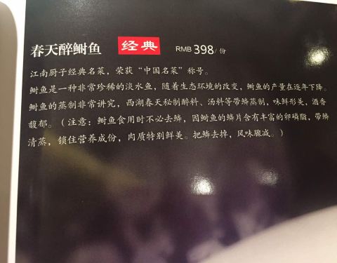 杭帮菜最近吃得不少,是日与朋友相约太古汇的江南厨子解决晚餐。 每次经过,人都不是普通的少。 令人欣慰的是,取号后可以到处乱逛,快轮到的时候店家会打电话通知, 毕竟是加收了10%的服务费+_+ 大厅颇大,大多是一家大细去聚餐的。 其实灯光昏暗感觉更适合调情。 服务态度其实还可以。 【出品】 大厅茶位,6。收服务费但水盅不会主动提供的,这点要扣分。6元的有菊花、普洱、铁观音等可选。 招牌宋嫂鱼羹,22。源自南宋的杭州传统菜,因为得到皇帝的爱而出名。要两份起点这种模式怎么也喜欢不上来……用料不马虎,有菇、鱼、咸火腿丝、葱丝等。微酸,朋友很喜欢,自己不太懂欣赏。 什菌豆腐煲,38。这道竟然是微辣……豆腐与想象有差距,三角的炸豆腐片,就是动漫里狐狸最喜欢的油炸豆腐……只有金针菇、冬菇之类,感觉不够“什”……素菜来说这款不便宜…… 灵隐寺素斋鹅,26。摆盘的问题,看着真的不像烧鹅,骗不了人……里面印象中有胡萝卜丝,还有菠菜什么的,口感倒是可以,适合餐前。 豆豉黄鱼,38。鱼鱼好少一条,两个人其实不够分……表面经油炸,肉质比想象中要嫩,小刺多这点不好…… 【整体评价】 1.虽然收服务费这一点有点心痛,但毕竟取号后可以周围溜达等呼叫,所以还是可以接受; 2.出品味道可以,比其他吃杭帮菜的店要贵一点,份量不太多。