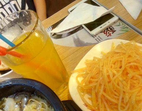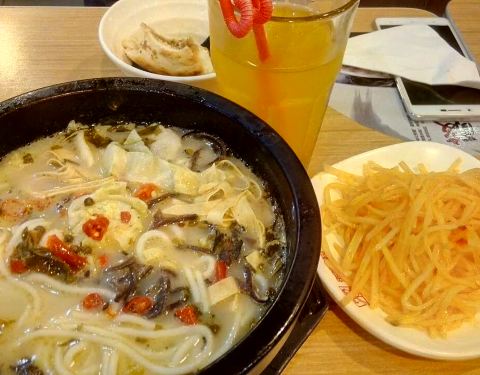 土豆丝分量刚好。凤梨汁服务员极力推荐说是大杯的,端上来后,发现就是普通的被子,没有她说的“大杯”。米线是:酸辣鱼的,味道特别棒,量特别大,我们两个女生都没有吃完,剩了好多。