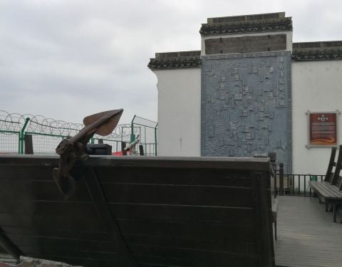 从上海南站乘坐金山铁路到金山非常方便。从地铁站出来就有路标指引,一路来到了金山铁路的乘车点。 金山铁路采用地铁式管理,跟普通火车不同。如果持有上海交通卡,则不需要买票,直接刷卡便可进站。买的票都是无座,上车后自己找座位随便坐。从上海南站到金山卫的票价为10元,直达车32分钟。从金山卫火车站南广场乘坐公交车奉卫线或者西卫线都可以到金山嘴站,下车便是金山嘴渔村。公交车只开了2站就到了,距离也就一公里多,下次来一定步行。 金山嘴渔村历史悠久,这里成陆于6000年前,位于杭州湾北岸,小村子到海边只有20米的距离,中间只隔着一条公路。从这个“金山嘴老街”的标志下台阶便可进入到村子里。这个村子的仿古建筑都是近两年修的,风格统一。由于是早上过来的,游人很少。看了一下指引牌,这里有几个小型的博物馆或者纪念馆,都是免费开放的,可以了解一个渔民的家庭生活以及观看展出的渔具。村子里的一条小河,沿街的建筑都是古式。村子并没有开发完,继续向里走去就是普通的民居,还没有装修成这种风格,自然也没有游人。