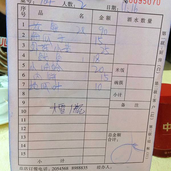 我们住的地方离那个湖滨中路店比较近,就去的这边儿,所有的菜感觉都比网上的价位要高一点,芒果汁挺好喝的,海瓜子儿挺好吃的,但是在菜单上没有发现有,我还是看见网友推荐才点的,味道可以就是吃起来有点儿费事儿。大竹蛏1份65元,感觉性价比不高。清蒸鱿鱼还可以。这个要收服务费的,一个人是三块钱。我们三个人点了五个菜,加一小瓶白酒和芒果汁,总共消费242元。
