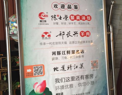 【位置】 导航过去,位置准确,门口、路边、后院都免费停车场。 【环境】 酒店很大,好几层楼,店堂中式风格,宽敞明亮,座位间距舒适。 进门的地方展示了可以外卖的食物,冰柜里储存了很多盒,有气势。 【服务】 店员都是大姐,国营店的感觉,大姐都很热情麻利,上菜很快。 午餐的炒菜只经营到13点,店员会准点拿单让你来先结帐,再慢慢吃。过后就只提供汤包了,其它食物要到晚餐才有。 买单用支付宝,可以先领券,再买单。 【食物】 陈士荣蟹黄汤包,110元一笼6只,灌汤包,店员帮忙从笼中移到盘子里,放上一撮姜丝,有破的可以免费更换一只。 汤包的皮薄Q弹,汤汁很多,入口不腥不腻,底部可以看到一层蟹肉、蟹黄。 蟹黄肉圆,12元一只,很大一只,肉紧且香,能看到粒粒蟹黄。 红烧长江杂鱼,48元,鱼形状完整,鱼肉入味入口即化,鲜甜不腥,好吃极了。卤汁拌饭也很赞。 生焖羊肉,158元,点菜时心中嘀咕有点贵,菜上来一看太值了,巨大一盘,每块肉都很大,肉的品质很好,入口有酒香,一点都不膻,肉略硬了一丢丢,再软烂点就完美了。 肉汁萝卜,28元,还不错。 河蚌青菜,38元,菜油烧的,香浓,蚌肉不老,青菜脆甜,用砂锅上菜,吃完都是热乎乎的,喜欢。 粯子粥,10元,靖江特产,元麦磨粉,冷水调成糊,粥烧好后调进去,据说特别滋补,浓稠度正好,好吃,配的玫瑰大头菜,脆甜爽口,很喜欢,下粥很好。 【评价】 靖江做汤包的传统老店,灌汤包品质不错,菜的口味也很好,没有雷区,个个好吃,5星推荐。