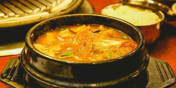一家位置风景很好的韩国料理店,南瓜很好吃,烤肉也不错,芝士鸡蛋卷个人不是特别喜欢,没有什么味道!中间是芝士可以拉丝!大酱汤配米饭,汤略咸,石锅拌饭还可以。
