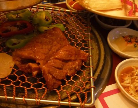 点了一份牛排骨肉和一份汤,肉让拿到旁边去烤了,不然实在太热。牛肉配椒盐好好吃,泡菜汤里是有肥牛的,大快朵颐。小菜的话,土豆泥煮的还挺烂的,其他都很好吃。