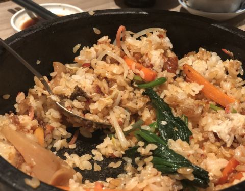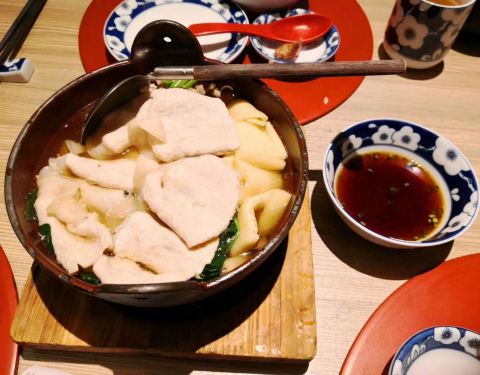 店在第三层露天美食区,不过这店得门面真的太低调,走过路过真的会完全略过。店内位置有限,所以就算工作日还是人人人人人人的聚集在门口等位。工作日定食来惊喜的很(工作日定食由68―128的价钱组成 平时也是会加收10%的服务费)点了个汁煮牛肉火锅,牛肉是美滋滋的肥牛 搭配不知名的小长带素食,好好好吃的说,这个很送饭,最后我连汤都喝光。