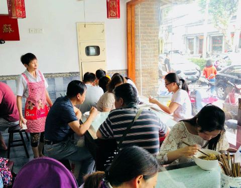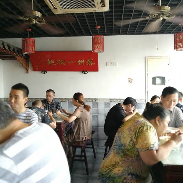 店里虽然好像没开灯黑咕隆咚的。 但是似乎不影响大家吃面的脚步和排队的热情!大家都围坐在八仙桌旁,一个个比谁面声大!热闹非凡~ 招牌上的“苏州第一面”究竟如何呢? 点了一碗招牌“爆鳝虾仁面”和“焖肉面”...店里虽然好像没开灯黑咕隆咚的。 但是似乎不影响大家吃面的脚步和排队的热情!大家都围坐在八仙桌旁,一个个比谁面声大!热闹非凡~ 招牌上的“苏州第一面”究竟如何呢? 点了一碗招牌“爆鳝虾仁面”和“焖肉面” 猪油香气顺着热气往我的鼻子里钻~ 赶忙抽一双筷子开始吸! 先喝一口汤~汤头都是微甜的酱油红汤,热滚滚的下肚~虾仁并不大,我也并没有点姜丝,毕竟比较相信这里这里虾仁过油的水平,果然不腥! 爆鳝也有其独有的鲜甜与韧劲,炸到刚刚好不焦的颜色放凉浸入酱油,盖在面上被我再放入面汤浸润~呼,美味! 焖肉是一块带皮猪腹肉,酥烂入味,咸香丰满! 面是微硬的精面,也是苏州人偏爱的细面,面骨劲道,挂汤厚落,一口接着一口根本停不下来!
