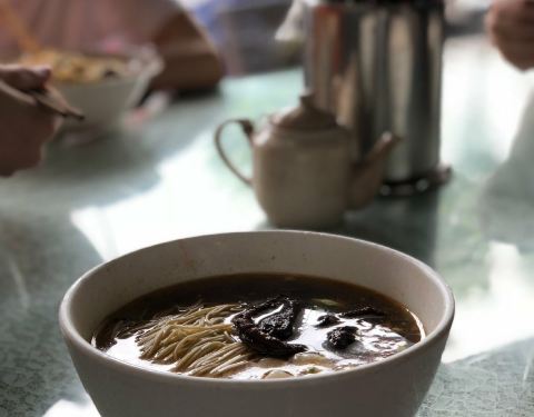 店里虽然好像没开灯黑咕隆咚的。 但是似乎不影响大家吃面的脚步和排队的热情!大家都围坐在八仙桌旁,一个个比谁面声大!热闹非凡~ 招牌上的“苏州第一面”究竟如何呢? 点了一碗招牌“爆鳝虾仁面”和“焖肉面” 猪油香气顺着热气往我的鼻子里钻~ 赶忙抽一双筷子开始吸! 先喝一口汤~汤头都是微甜的酱油红汤,热滚滚的下肚~虾仁并不大,我也并没有点姜丝,毕竟比较相信这里这里虾仁过油的水平,果然不腥! 爆鳝也有其独有的鲜甜与韧劲,炸到刚刚好不焦的颜色放凉浸入酱油,盖在面上被我再放入面汤浸润~呼,美味! 焖肉是一块带皮猪腹肉,酥烂入味,咸香丰满! 面是微硬的精面,也是苏州人偏爱的细面,面骨劲道,挂汤厚落,一口接着一口根本停不下来!