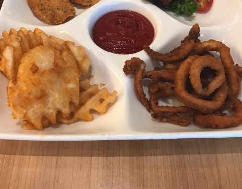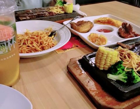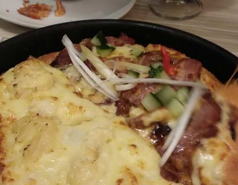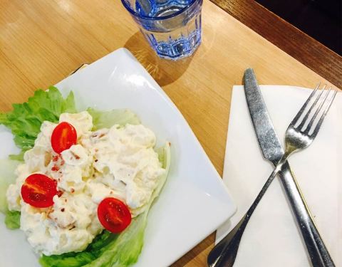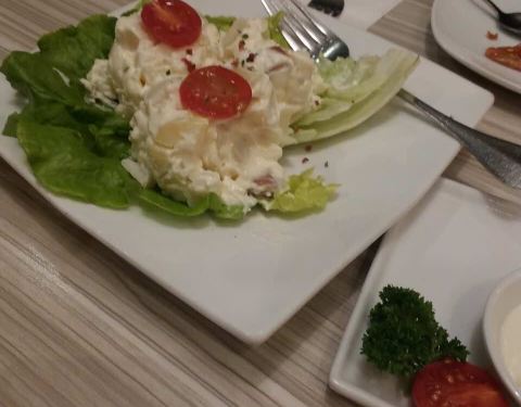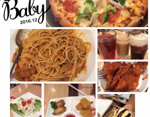 土豆沙拉看起来就么有食欲啦,建议外形改造一下。四拼披萨很不错哦哦,凤尾虾炒鸡好吃