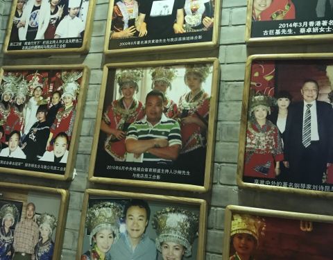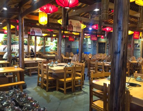 【餐厅环境】:装修风格就是苗家风格,可惜不够彻底,一眼看去感觉就是现代简约风加上苗寨风格。服务员着装很有风格,男的是都是一身藏蓝色民族服饰,斜跨着一个蓝色黄色相间的苗寨风格小包。据说晚上7点半的时候...【餐厅环境】:装修风格就是苗家风格,可惜不够彻底,一眼看去感觉就是现代简约风加上苗寨风格。服务员着装很有风格,男的是都是一身藏蓝色民族服饰,斜跨着一个蓝色黄色相间的苗寨风格小包。据说晚上7点半的时候还有歌舞表演,可惜我去的时候太晚了,只看到个退场的画面。餐桌都是大木桌凳子也是大木凳,特别敦实,一看就特朴实的感觉。