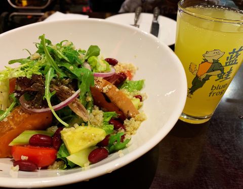 蓝蛙是一直惦记着去拔草的地方,赶上团购活动很超值,牛肉汉堡多汁,配了炸薯片和辣椒酱;牛油果沙拉里含有藜麦,比较爱吃,沙拉味道一般。菠菜鸡肉春卷,还有巧克力布朗尼(配香草冰淇淋)很好吃。