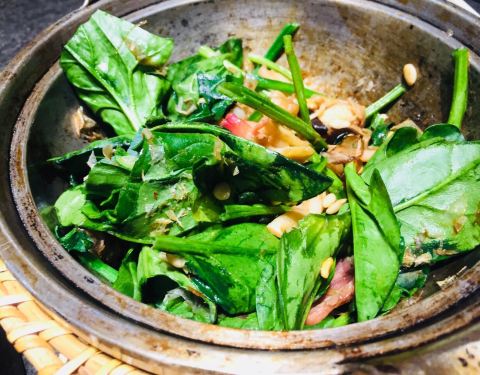 - 温沙拉值得推荐,锅底炒热盖上生菠菜叶,倒入瓜子榛仁等坚果搅拌即食