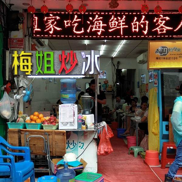 三亚 除了滨海风光,当然莫属海鲜大餐大放异彩了,在这里可以真正的体验到原滋原味的美味海鲜,第一市场是 三亚 最有名气的海鲜市场了,在这里你可以让眼睛过足瘾,可以看见很多从来未曾见过的海鲜。逛完第一市场,带着海鲜来到梅姐川味海鲜加工餐厅,这家店是我朋友推荐的,说她家的海鲜口味不错,来到店里,装修风格还不错,门口有一个炒冰,正好口渴了,赶紧要来一杯尝尝鲜。