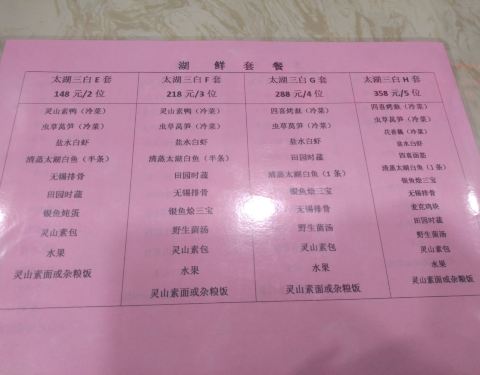 灵山大佛景区真的太商业化了点,吃饭的地方不少,本想吃素食,后来看到套餐不错,就进来了。 选了太湖三白E套餐148元,先到收银台付款,拿着小票找了个靠窗的位置,就餐的人多服务员太少,满场追着找,不过给了...灵山大佛景区真的太商业化了点,吃饭的地方不少,本想吃素食,后来看到套餐不错,就进来了。 选了太湖三白E套餐148元,先到收银台付款,拿着小票找了个靠窗的位置,就餐的人多服务员太少,满场追着找,不过给了小票后立即来换了桌布,送上餐具。 双人套餐量不少,两个人都没吃完,胃口小的三个人完全能吃,素面真的不好吃,寡淡无味,白虾有几只死了,蘸醋会比较好,半条白鱼不错,也是蘸醋更好,银鱼炖蛋也偏淡,无锡排骨甜甜的很合本人口味,素菜包的馅很好吃,本人只吃馅没吃皮,在景区这样的套餐还是挺不错的。