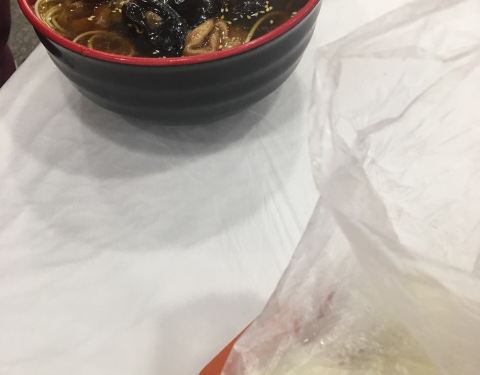 进入景区之后过了中午饭点,差不多快二点了到那里还是人山人海。也不去计较,有的吃即可。里面包厢有问过,虽然环境好,但要1500元一桌。外面大堂一碗面25元,灵山包子十元六个,六款冷菜15元一例任选。这样一买就是三张单子,取东西就是三个队伍。灵机一动,再花15元买了包烤麸,发觉蛮好吃的。