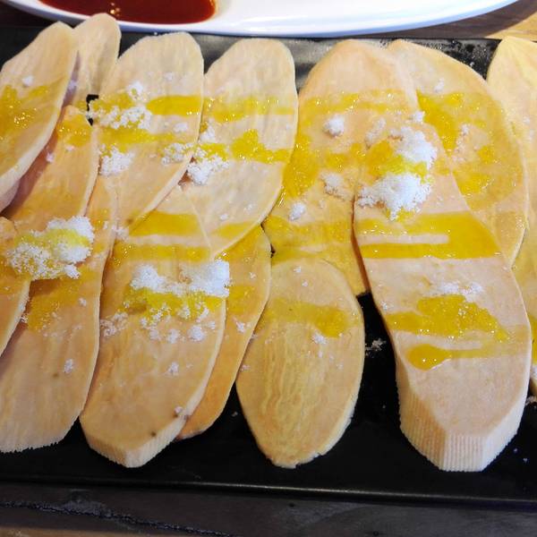 还有一盘地瓜和生菜,生菜卷肉很好吃。口感新鲜,带着大海的味道。道路上车辆虽多但是并不喧闹