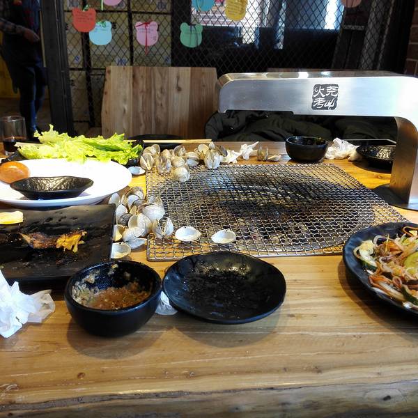 海鲜烧烤本地排名第一的必须得尝一尝海边回来大概快八点了,这家和另外一家海鲜烧烤挨着,其实觉得另一家人更多,但还是决定相信大众点评由于赶上中元节,本来想坐在车水马龙外面,但老板提醒会有灰,所以还是进店里了!二层楼!服务员麻利热情!点了招牌的烤鸡爪,后来又追加点了朋友吃第一口就吃出来应该是熏过再烤的!椒盐虾爬子越吃越香,停不下来!辣炒杂贝没感觉惊艳,口味一般,还有点儿牙碜!烤串类:筋皮还可以,小串一般!水舀子毛肚上菜特别慢,毛肚有点儿腻,朋友爱吃里面的豆芽,我爱吃小香肠
