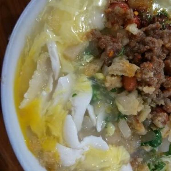 她们家的蛋冲的形态非常...众所周知峨眉豆腐脑是有别于乐山豆腐脑的另一大派,其中又以这家的蛋冲豆腐脑最为有名~ 她们家在素豆腐脑之外,都是配有牛肉及酥肉的,不能单选,唯一可以选择的就是蛋冲或者不蛋冲~