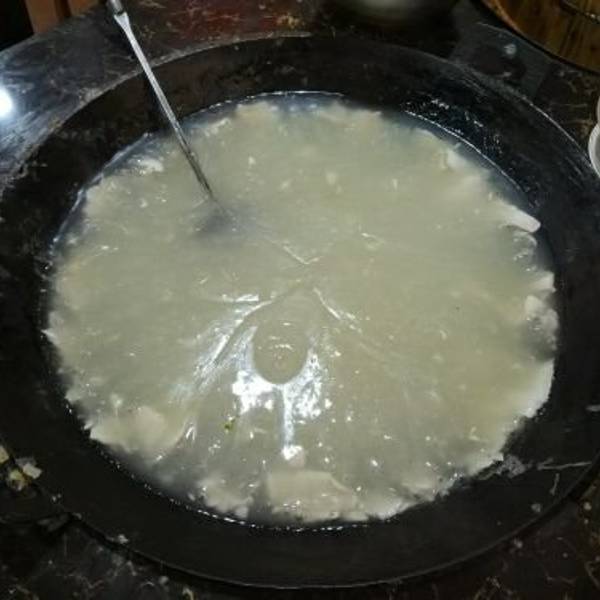 吃完结账时发现,原来豆腐脑不是煮于芡羹之中的,大锅之中只有保持温度的芡羹稠汤,豆腐脑是用单独的盆子装载的,待需要之时,舀出一块再往芡羹稠汤里烫上一烫组合而成的~ 可惜起初并未在意,而没有看到蛋冲的手法,稍有遗憾~