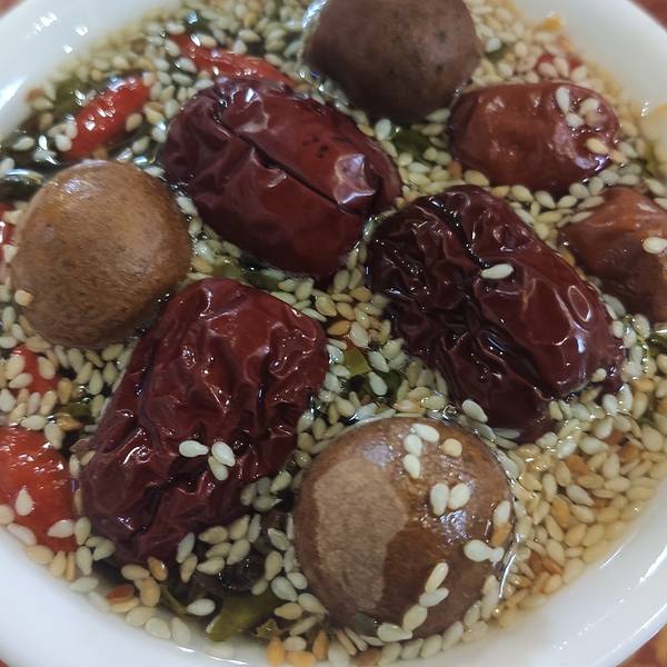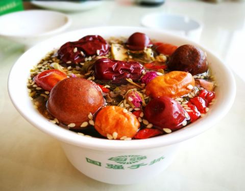 自制的八宝茶,味道很不错,强烈推荐,里面用料讲究核桃仁,葡萄,红枣,桂圆,各种各样的。