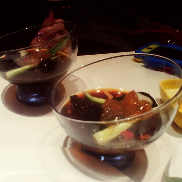 草莓火龙果饮料,冰镇的,口感很好。鹅肝酱牛排,鹅肝酱好吃,嫩嫩的,牛排火候也不错。捞汁什锦,盘子好美