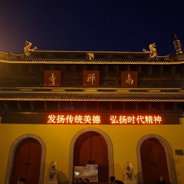 南禅寺虽然不大,但香火旺盛,沿无锡古运河而建的历史街区与寺庙相连,寺内的妙光塔在一片粉墙黑瓦的建筑中很是显眼,是这一带的地标。在寺庙礼佛完毕后,你可以到附近逛街吃美食,这里的夜景也值得一看。 南禅寺始建于南朝梁武帝太清初年(公元547年),后代屡有兴废,现在看到的寺庙是20世纪八、九十年代重修的。 寺庙的大门在南端,南北走向的中轴线上仅有大雄宝殿等几座建筑。东侧的妙光塔高7层,在塔上看底下仿古建筑连成一片的屋顶,眺望南边古运河畔的南禅寺码头,依稀有一幅古运河画卷在眼前展开的感觉。寺庙大门东侧的素食馆有素斋吃,可以点外卖带走。 南禅寺周边形成了商贸区,小吃、古玩市场、花鸟市场、书城应有尽有,可以逛街淘点小玩意。小吃和无锡多数旅游景点差不多,臭豆腐、无锡排骨、烤鸡翅都有,出了寺庙是南禅寺步行街,往东走几步在寺庙隔壁就有一家穆桂英美食,被一些游客称为“参观完南禅寺一定要去吃一下”的地方,主营糕点和小吃,玉兰饼、青团、小笼、粽子都不错。 每当夜幕降临,南禅寺和古运河边的老宅子亮起了灯,老宅子上挂着的一串串红灯笼倒映在运河里,漂亮的夜景吸引了不少长枪短炮。建议一定要沿运河散散步,或者到南禅寺码头坐游船游览清名桥古运河景区。运河水上巴士(即游船),由南禅寺码头向东南行驶到水仙道院,再折回南禅寺码头。 坐在游船上,从南禅寺码头到跨塘桥一段见到的是时尚老建筑,阳春巷商业区。从跨塘桥到清名桥是精华部分,被称为“江南水弄堂,运河绝版地”,由老房子改造成历史街区,可以发现许多临水的美人靠、小露台。建议坐游船到水仙道院下,然后步行回南禅寺码头,有兴致也可以拐到阳春巷逛逛。
