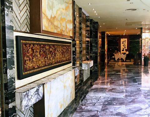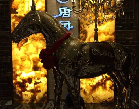 感觉味道很不错,这个奶黄包的造型实在…猪杂粥是自选材料干净脆爽。白灼芥蓝和生菜美味鲜嫩, 儿子很喜欢,吃了很多。店内装潢富丽堂皇,银色的大马闪亮登场。