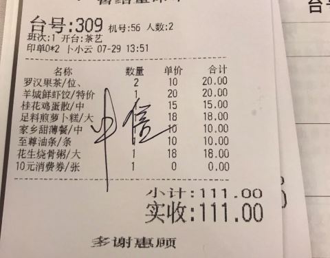 中午和朋友来到2号唐厨(优托邦店)喝茶。 2号唐厨(优托邦店)位于珠江新城花城大道中84号优托邦1座6层,从地铁五号线猎德站A口出来,步行几分钟就到达,交通非常方便。 中午十二点钟,大厅还有一些空位,找了靠里面的地方坐下,后来才感到后悔,里面比外边吵很多。 环境富丽堂皇,不过服务跟不上。例如让服务员开普洱茶,她却上了罗汉茶,后来才知道后者贵一些。又如午市一桌可以点两个特价点心,询问服务员爱理不理的,最后才拿出特价菜牌。再有加水服务员也是千呼万唤不出来。 【桂花鸡蛋散】挺大份的,蛋散酥脆,沾着桂花蜜吃,蛋味和桂花的香味融为一体。 【家乡甜薄餐】一碟三口,很香脆,里面是花生、芝麻鲜。 【至尊油条】很大条,卖相一般,吃起来不脆,不过比较松软。 【羊城鲜虾饺】一笼四只,虾饺皮薄馅多,里面有好多只新鲜爽口的大虾。 【花生烧骨粥】量较多,粥底绵滑,鲜美可口。 【足料煎萝卜糕】较大的三块,煎得金黄,能吃到里面的萝卜丝和腊味粒。 埋单111元,人均消费56元。 总的来说2号唐厨(优托邦店)环境高大上,出品可口,服务有待提高。